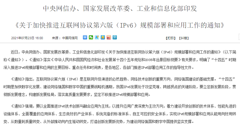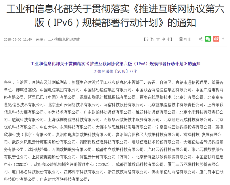 根據中辦、國辦下發(fā)的《行動計劃》和工信部下發(fā)的《通知》:2018年末,省級政府網站,央企網站和新聞媒體網站全部改造支持IPv6;2020年末,市級政府和新聞媒體和工業(yè)互聯(lián)網應用支持IPv6。...