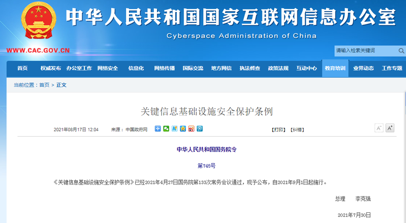 中華人民共和國國務院令第745號《關鍵信息基礎設施安全保護條例》已經2021年4月27日國務院第133次常務會議通過,現(xiàn)予公布,自2021年9月1日起施行??偫怼 ±羁藦?021年7月30日關鍵信息基礎設施安全保護條例第一章 總 則第一條 為了保障關鍵信息基礎設施安全,維護網絡安全,根據《中華人民共和國網絡安全法》,制定本條例。第二條 本條例所稱關鍵信息基礎設施,是指公共通信和信息服務、能源、交...